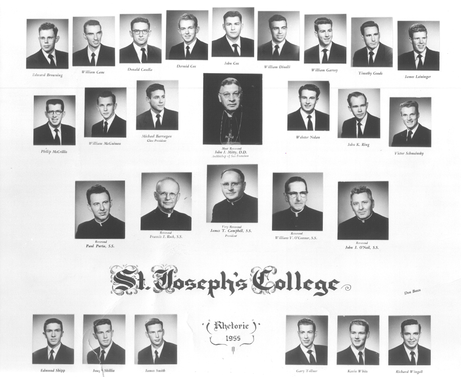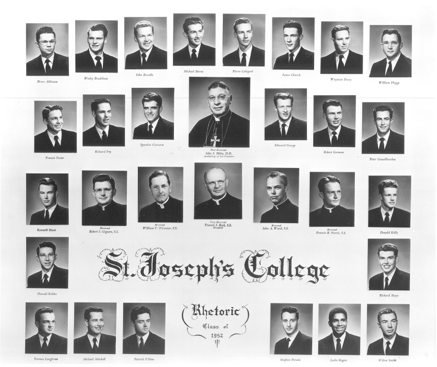 At the end of each year, the graduating "Rhet" class would have its pictures taken and a class picture made up of the individual members of the class would be created to be hung in the corridor just off the main building entrance. Each of these pictures included a picture of Archbishop Mitty, the President of St. Joseph's and few other "profs" chosed by the Rhet class to share their picture space. Each year, we would individually purchase small copies of the Rhet class picture and get the graduating Rhets to write messages to us on the back of our copy. I believe we had a word that described these smaller versions of the Rhet class picture but it escapes me. So that will be trivia question #1. Any takers? You can submit your answers on the comments page. We now have an answer. Denny Reidy recalls that the Rhet class picture was called the "medley". That sounds right to me.